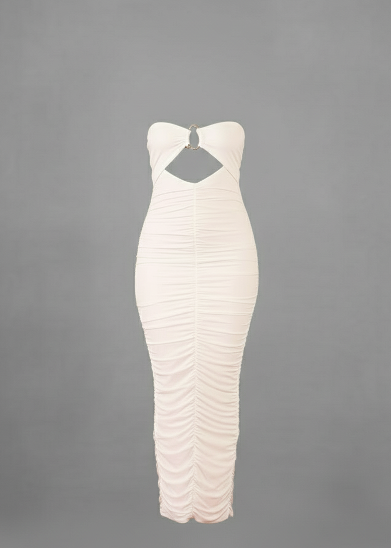 White Ruched Bodycon Fit Slinky Bandeau Midi Dress