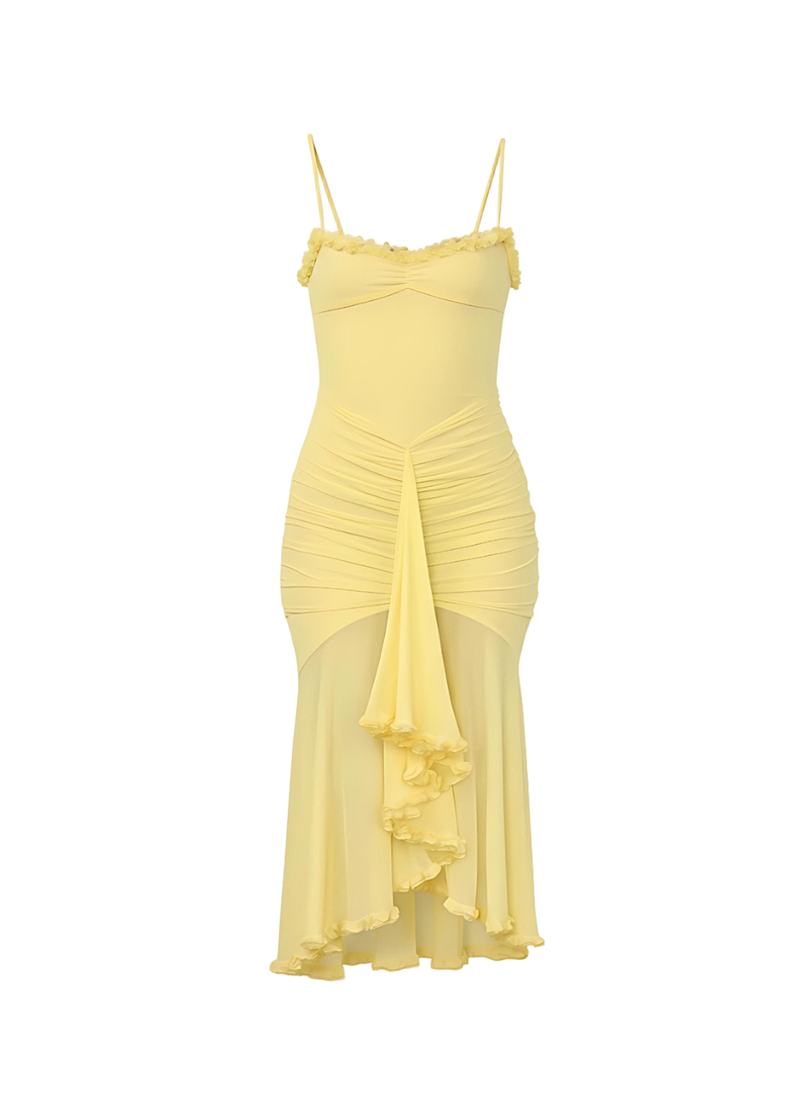Yellow Ruched Bodycon Mesh Classic Party Midi Dress